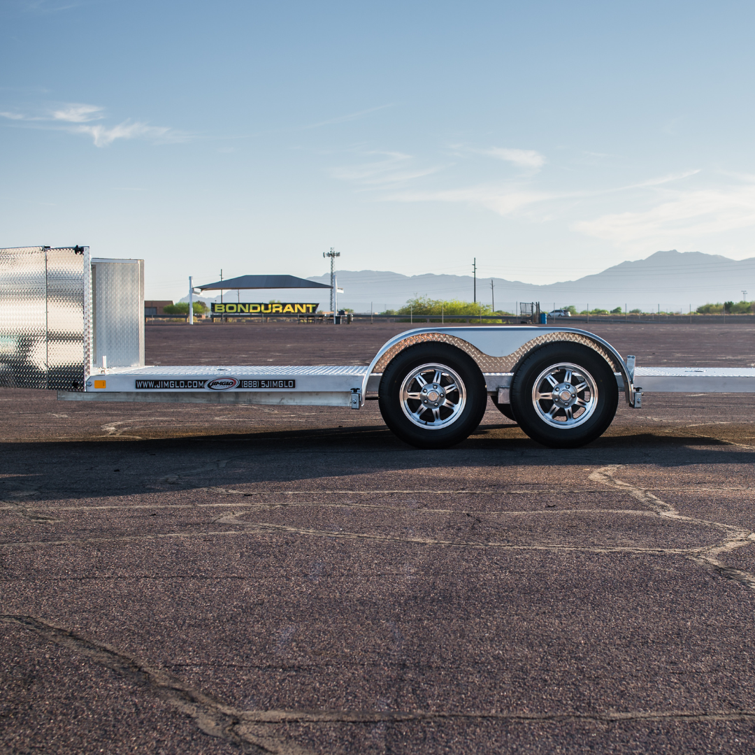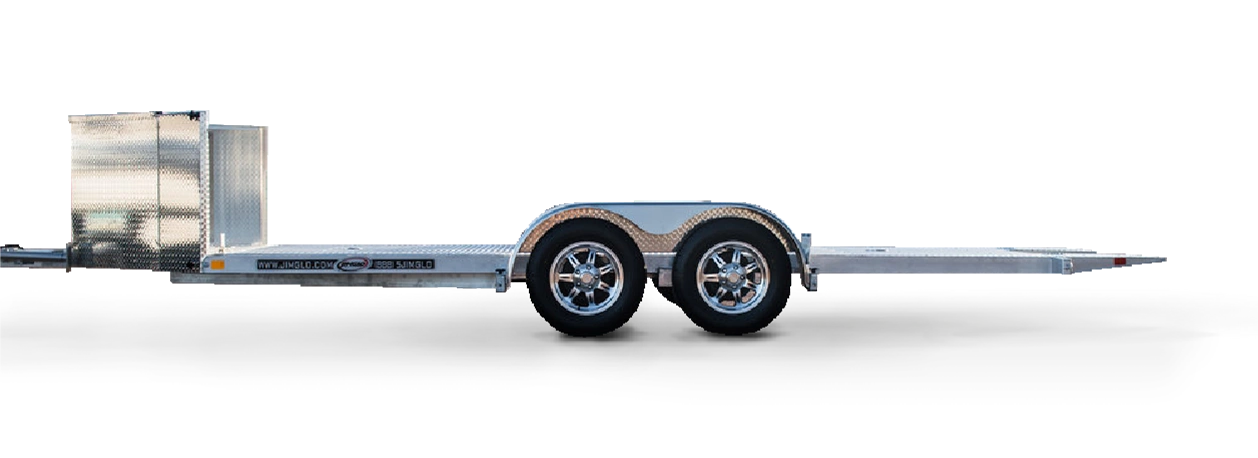 The need for ramps is eliminated with the JIMGLO Ego. The aluminum open car trailer operates on a unique 2 frame system, the bed frame and the chassis frame. The frames operate in unison but separate from one another. Loading your low car onto our low profile car trailer is made easy with the extra-low ramp angle allowing clearance for the lowest of cars.